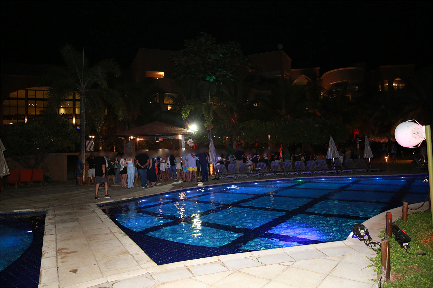 Boas-vindas: Pool Party descontraída para recepcionar os participantes.